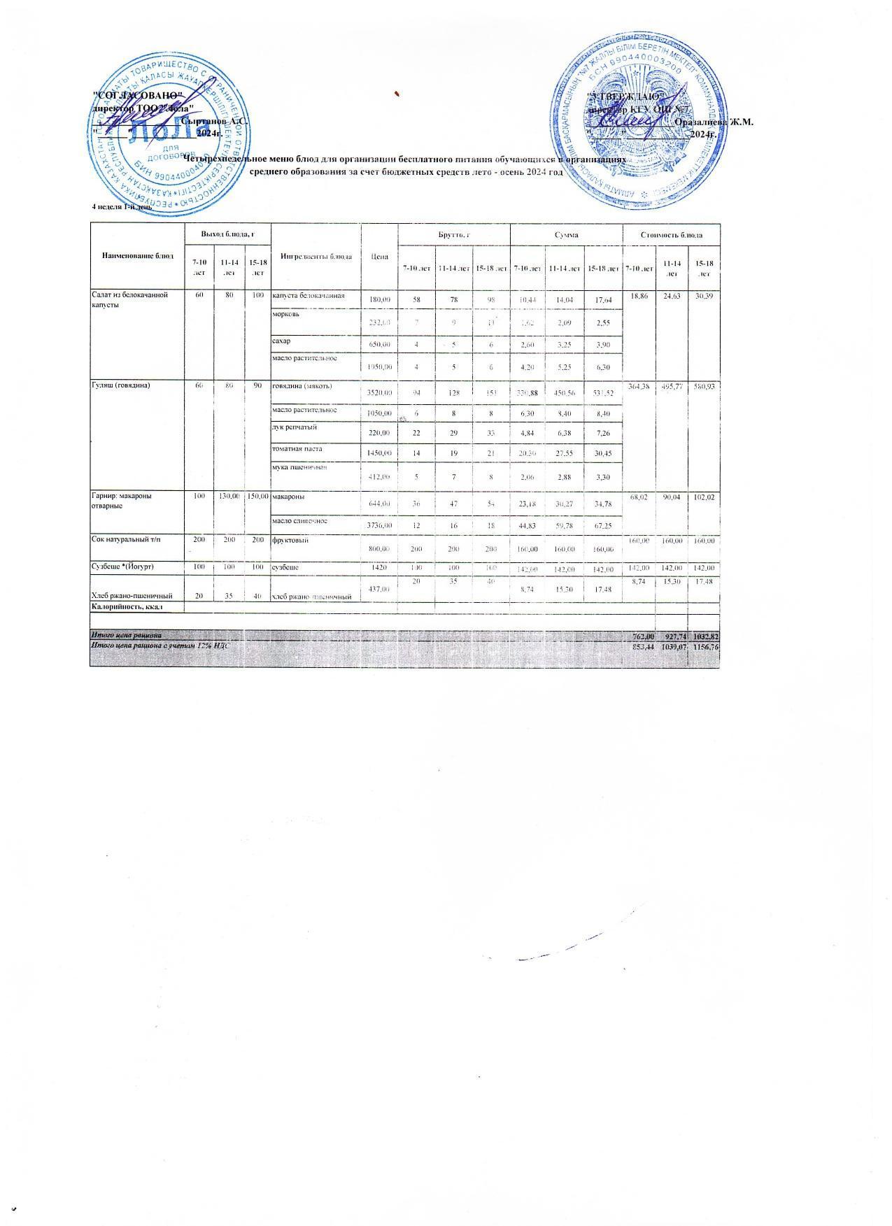 23 қыркүйек 2024 0 1 2 3 4 5 Ас мәзірі 4 апта 1 күн Бюджет қаражаты есебінен орта білім беру ұйымдарында білім алушыларды тегін тамақтандыруды ұйымдастыру үшін төрт апталық ас мәзірі Осы беттің QR-коды:QR-код этой страницы: