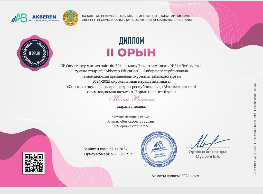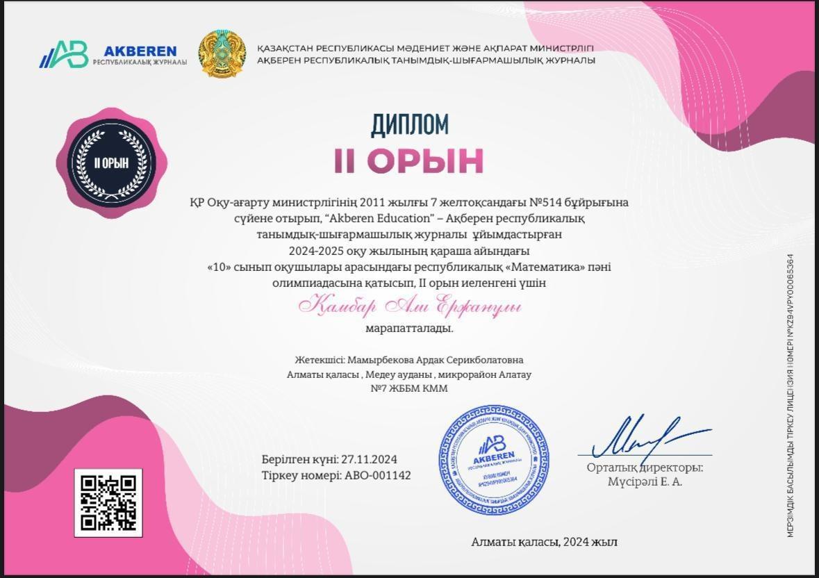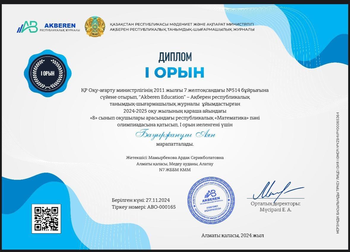 КГУ «Общеобразовательная школа №7» Управления образования города Алматы