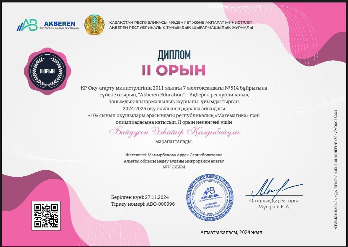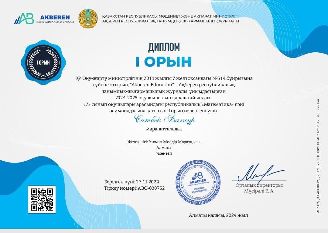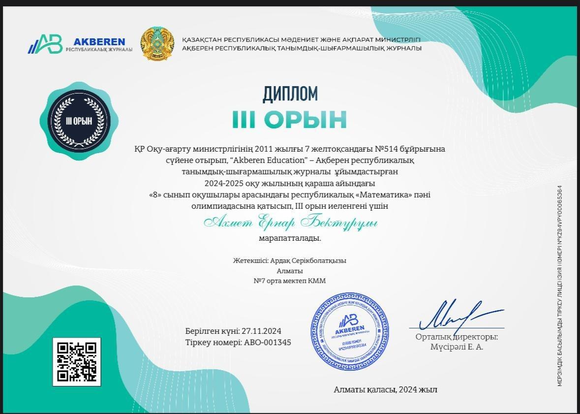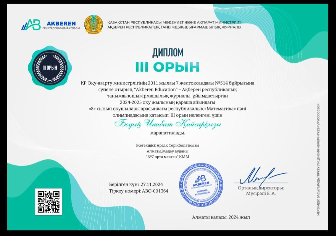 КГУ «Общеобразовательная школа №7» Управления образования города Алматы