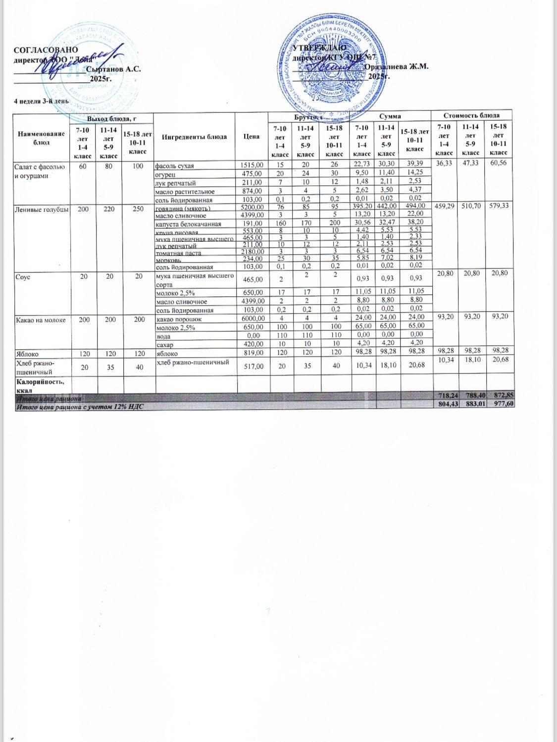 22 қазан 2025 0 1 2 3 4 5 Ас мәзірі 4 апта - 3 ші күн Бюджет қаражаты есебінен орта білім беру ұйымдарында білім алушыларды тегін тамақтандыруды ұйымдастыру үшін төрт апталық ас мәзірі Осы беттің QR-коды:QR-код этой страницы: