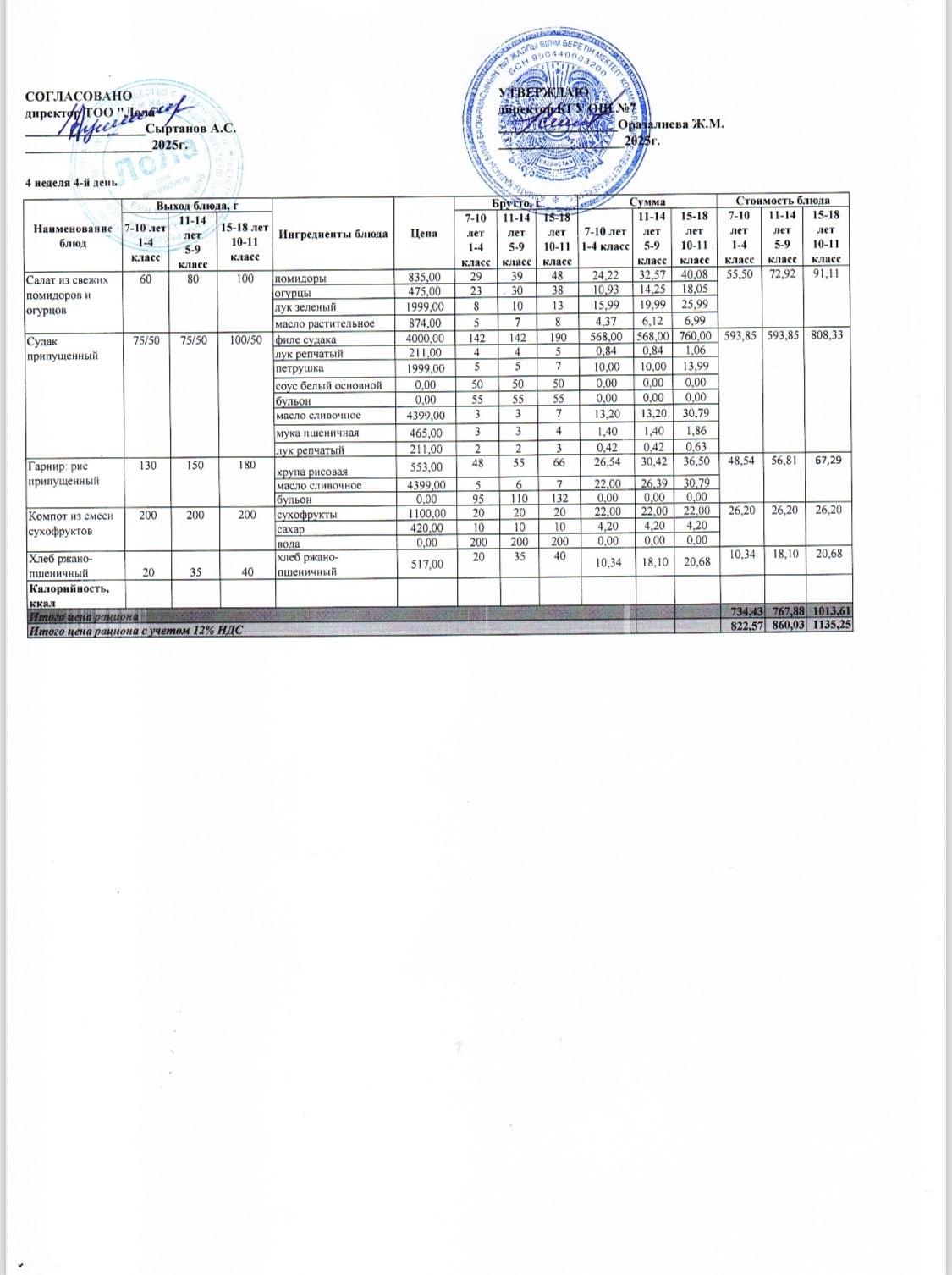 23 қазан 2025 0 1 2 3 4 5 Ас мәзірі 4 апта - 4 ші күн Бюджет қаражаты есебінен орта білім беру ұйымдарында білім алушыларды тегін тамақтандыруды ұйымдастыру үшін төрт апталық ас мәзірі Осы беттің QR-коды:QR-код этой страницы: