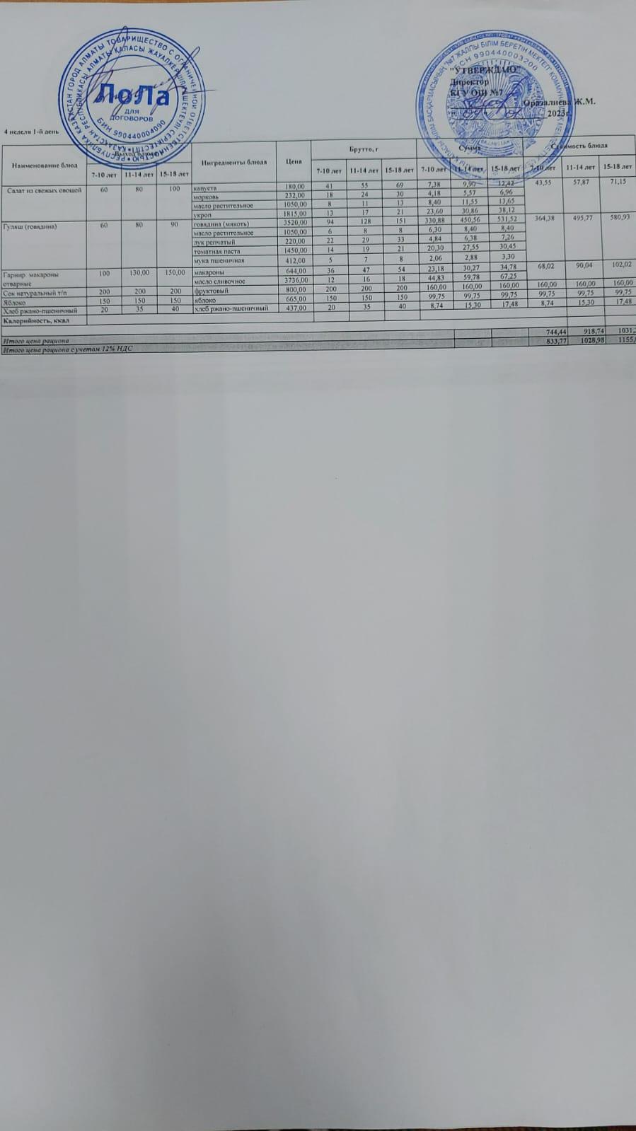Четырехнедельное меню блюд для организации бесплатного питания обучающихся в организациях среднего образования за счет бюджетных средств