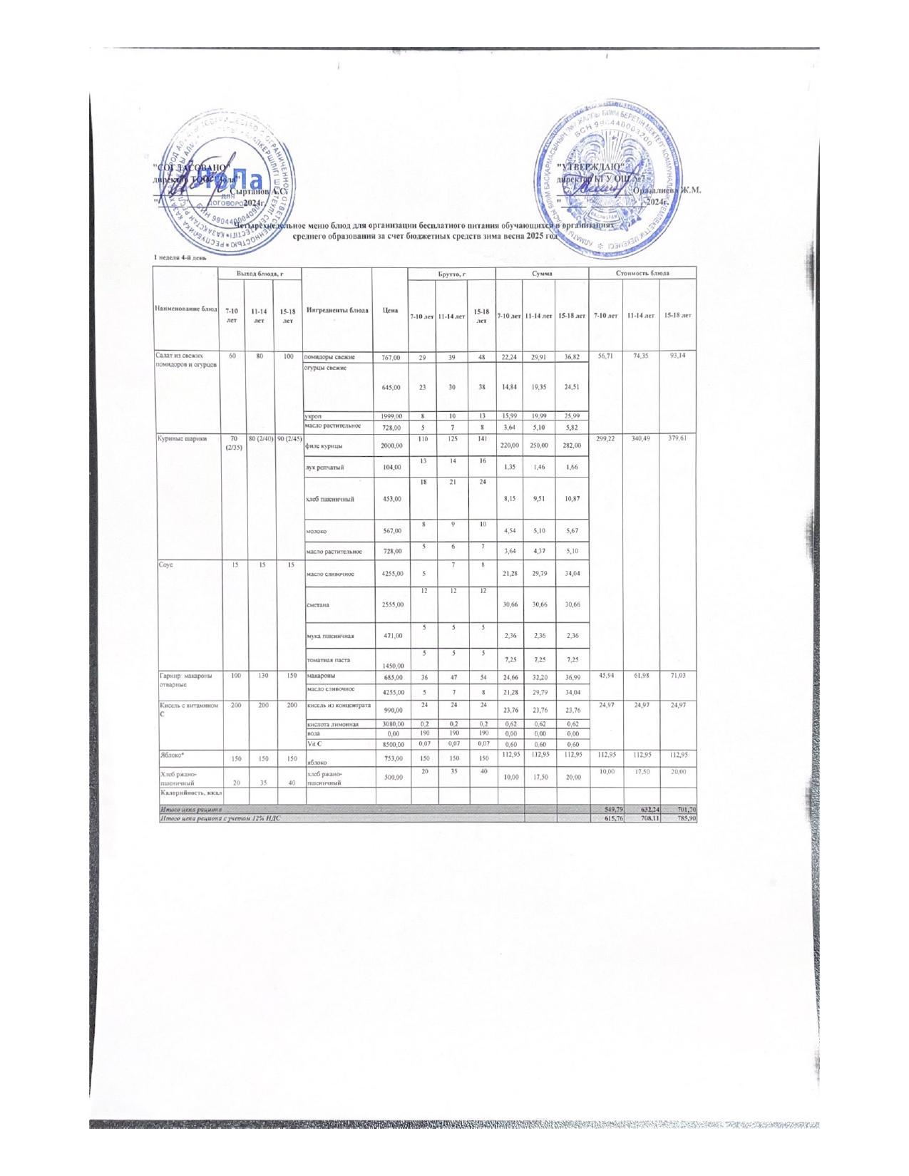 06 ақпан 2025 0 1 2 3 4 5 Ас мәзірі 1 апта 4 күн Бюджет қаражаты есебінен орта білім беру ұйымдарында білім алушыларды тегін тамақтандыруды ұйымдастыру үшін төрт апталық ас мәзірі Осы беттің QR-коды:QR-код этой страницы: